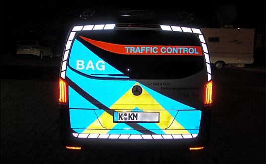 Odblaskowe folie mają zakrzywione pasy w kolorze niebieskim ze wszystkich stron pojazdu. Obok pasów znajduje się pomarańczowym napis „BAG” lub „Traffic Control”.