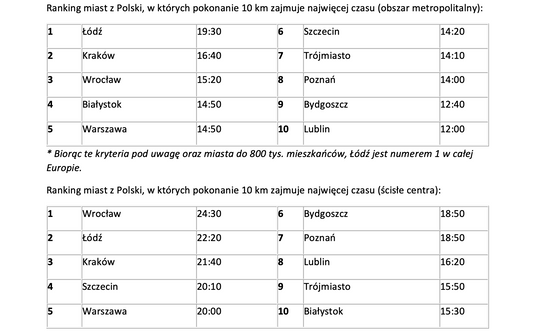 W porannym szczycie kierowcy w Łodzi 10 km jadą w 21 minut, a w popołudniowym 25 minut. Obydwie te wartości są najwyższe spośród wszystkich miast w Polsce. Średnia prędkość, z jaką przemierzają dystans 10 km w porannym szczycie to 28 km/h, a w popołudniowym szczycie zaledwie 24 km/h. Te wartości są najniższe w skali kraju.