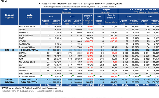 W grudniu 2024 roku grudniowe rejestracje ciągników siodłowych zmalały o 31,8 proc. do 1861 szt., gdy spadek w całym 2024 roku wyniósł 25,2 proc. do 25 703 sztuk. Rejestracje nowych samochodów ciężarowych o dmc powyżej 3,5 tony zmalały w 2024 roku o 20,9 proc. do 28 084 sztuk, a w grudniu spadek wyniósł 22,9 proc. do 2300 sztuk, wynika z danych Polskiego Związku Przemysłu Motoryzacyjnego.