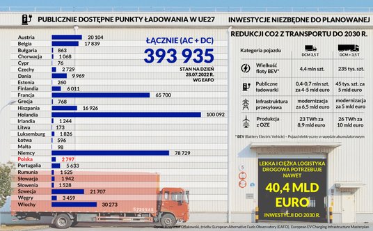 Tylko do końca dekady infrastruktura dla lekkiej i ciężkiej logistyki potrzebuje nawet 40,4 mld euro, nie licząc kosztu wymiany floty, który spadnie na firmy transportowe. Te nadal kupują pojazdy spalinowe i czekają z elektryfikacją, ponieważ brakuje zachęt, elektryki są drogie, a rynek energii nieprzewidywalny. Poza tym nie ma ładowarek, a konkurencyjność cenowa pojazdów ciężkich spodziewana jest dopiero za 12 lat.