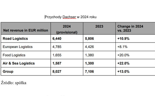 Przychody Dachser wzrosły w 2024 roku o 13 proc., przekraczając próg 8 miliardów euro. – Rozwój mógłby być jeszcze bardziej dynamiczny, gdyby nie brak impulsu wzrostowego z Niemiec i Europy. Wysokie koszty, niska produkcja przemysłowa i spadek konsumpcji miały wpływ również na naszą działalność. Do tego dochodzą liczne globalne kryzysy, które były poważnym testem wytrzymałości zarówno dla naszych klientów, jak i dla nas – przyznał dyrektor zarządzający Dachser Burkhard Eling.