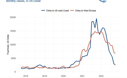 Spowolnienie w handlu i przewozach oceanicznych pozwoli rozładować zatłoczenie. Mniejszy popyt spowodował gwałtowny spadek cen transportu oceanicznego. W ostatnich 4 miesiącach spadły na trasie pacyficznej do niemal poziomów sprzed pandemii, na trasie atlantyckiej zmierzają w tym kierunku.