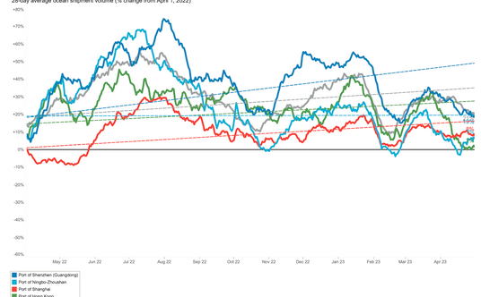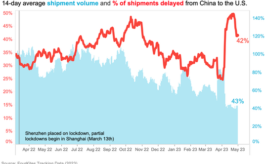 Czas oczekiwania na podjęcia kontenera w chińskich portach zmalał w ostatnim roku o 62 proc., a wielkości przewozów z Chin do USA zmalały o 44 proc. wylicza FourKites. Czas transportu także zmalał z ponad 55 dni w szczycie do mniej niż 36 dni. Czas jednak znów zaczyna się wydłużać, ponieważ armatorzy oszczędzając paliwo zmniejszyli szybkość statków.