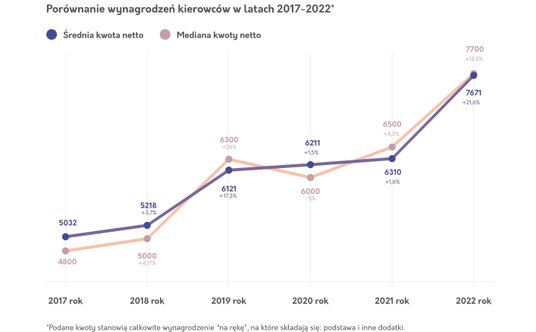 Nowy raport PITD pokazał, że wynagrodzenie kierowców zawodowych w Polsce netto sięgnęło 7700 zł (mediana) lub 7671 (średnia). Blisko 60 proc. pytanych potwierdza podwyżki, a jedna trzecia zapewnia, że nie zmieniły się. Wzrost spowodowany był wojną na Ukrainie i odpływem kierowców, rosnącą inflacją oraz wprowadzeniem kolejnych przepisów Pakietu Mobilności.