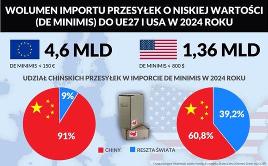 Klienci europejscy zamówili w 2024 roku 4,6 mld tanich paczek zwolnionych z cła. W USA takich przesyłek było 1,36 mld. Większość to zamówienia e-commerce z Chin, w Unii to 91%, w USA 60,8%. KE wycofuje się jednak z zasady de minimis w imporcie, clone będą wszystkie przesyłki.