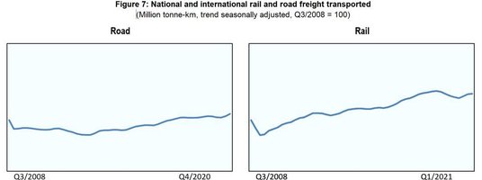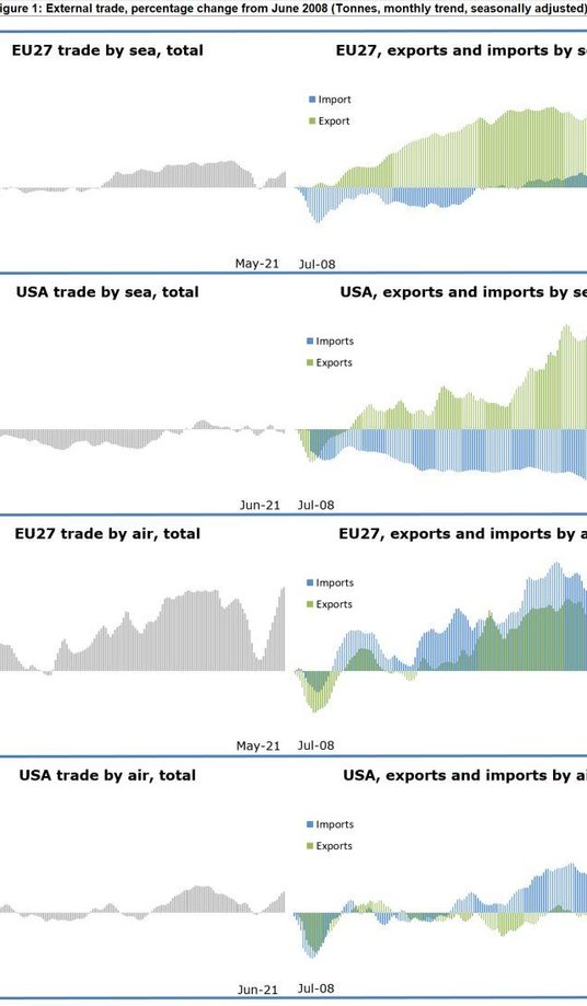 W przewozach morskich po spadkach w okresie od kwietnia do czerwca 2020 roku (w stosunku do czerwca 2008 roku o 1 proc. w EU i 4 proc. w USA), przewozy morskie w UE od sierpnia 2020 roku rosną i w maju 2021 roku były o 9 proc. wyższe niż w czerwcu 2020 roku.