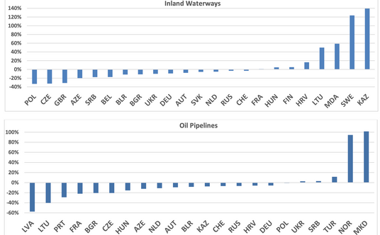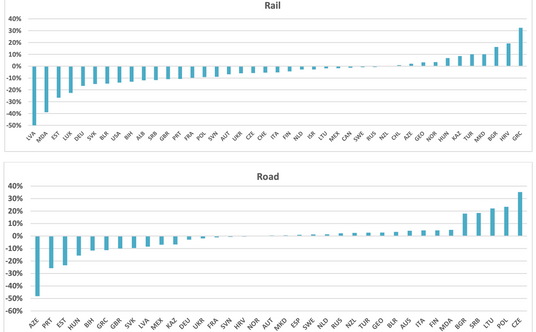 W 19 państwach praca przewozowa transportu samochodowego była większa niż średnia w okresie przedpandemicznym. Największy wzrost zanotowano w Czechach (+35%), w Polsce (+23%), Litwie (+22%) oraz Serbii i Bułgarii (oba kraje +18%).