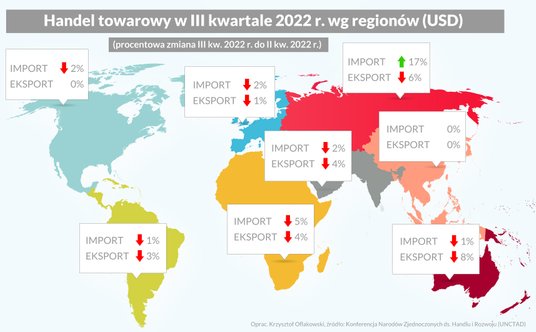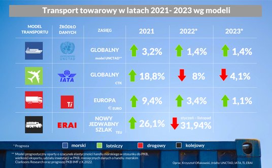 Kolejnym przykładem spowolnienia będzie światowy rynek usług spedycyjnych, który w 2022 r. ma urosnąć normlanie o 27,6%, ale realnie będzie to spadek o 2,4% w porównaniu z rokiem poprzednim. Przewozy lotnicze skurczą się realnie o 2,7%, natomiast morskie o 2,2%. Realny wzrost całego rynku w 2023 r. szacowany jest na poziomie 0,7% do wartości ponad 265 mld euro. Przewozy lotnicze urosną o 0,8%, natomiast morskie o 0,7%. Motorem napędowym ponownie będzie obszar Azji i Pacyfiku, gdzie rynek urośnie o 1,3% (po 1,3% dla transportu morskiego i lotniczego). Rynek europejski urośnie o 0,5% (lotniczy 0,6%, morski 0,5%), a w Ameryce Pn. o 0,1% (lotniczy 0,1%, morski 0%).