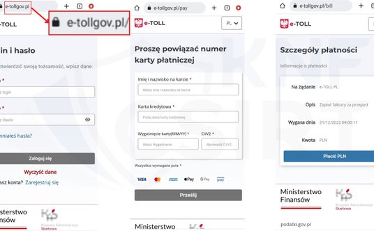 Oszuści założyli stronę e-tollgov.pl, która różni się tylko jedną kropką od strony rządowej e-toll.gov.pl. Nie dość, że podobny jest adres, strona wykorzystuje logotypy MF, KAS oraz e-TOLL. Oszuści nakłaniają użytkowników do dokonania płatności za przejazd w e-TOLL i w ten sposób wyłudzają dane z kart płatniczych.