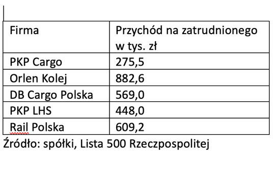 Wśród przewoźników kolejowych PKP Cargo ma najgorszy wskaźnik przychodu na zatrudnionego. W 2023 roku wyniósł on 275,5 tys. zł i był niemal dwukrotnie mniejszy niż w DB Cargo Polska (569 tys. zł). Czyli dla wytworzenia przychodu w wysokość miliona złotych PKP Cargo potrzebuje czterech osób, gdy konkurent tylko dwóch.