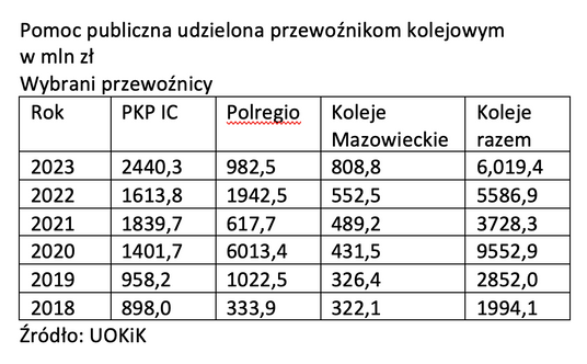 W ub.r. Polrgio przewiozło 100 mln pasażerów, firma nie ma jednak za co wymienić taboru. W latach 2018 – 2023 pomoc publiczna dla przewoźników kolejowych wzrosła dwukrotnie do 6 mld zł rocznie, dzięki czemu mają oni pieniądze na funkcjonowanie. Tylko Polregio otrzymało w tych latach blisko 11 mld zł, jednak spółki nie stać na nowy tabor. – Największym przegranym programu taborowego KPO jest Polregio. Najpierw było wyłączone z dostępu do finansowania unijnego, bo wystąpiło z wnioskiem o akceptację pomocy publicznej na restrukturyzację. I tak umknęły pieniądze z poprzedniej perspektywy unijnej. Później nie mogło zebrać środków na wkład własny do mocno opóźnionego KPO – przypomina prezes Fundacji ProKolej Jakub Majewski.